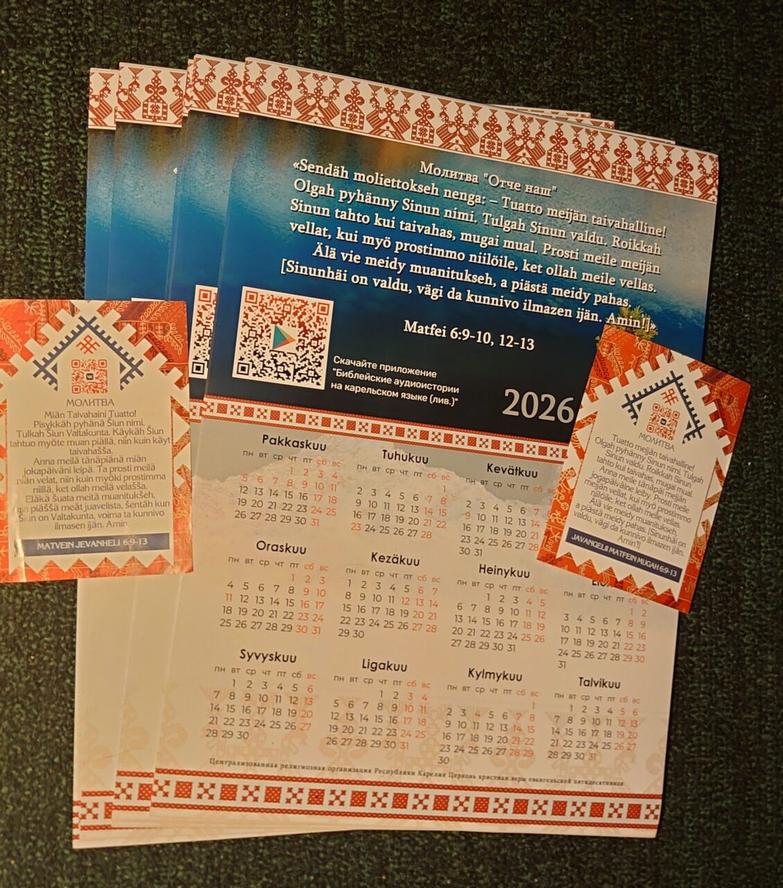 Мы уже представляли вам календарь на 2026 год, выпущенный Церковью христиан веры евангельской. Название месяцев в нём и молитва «Отче наш» оформлены на ливвиковском наречии карельского языка. А приведённый здесь же QR-код позволяет установить приложение для смартфонов «Библейские аудио-истории на карельском языке».
