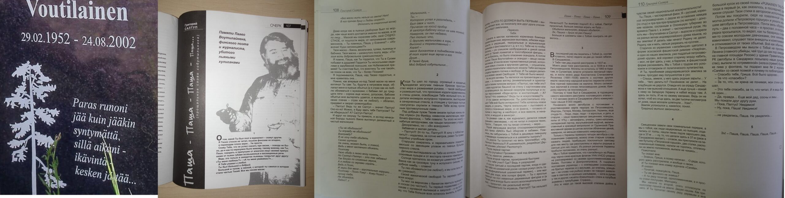 К вашему вниманию (в прикреплённом фото) также статья хорошего знакомого Пааво Воутилайнена — Григория Салтупа, скульптора и искусствоведа, автора таких произведений, как «Царевна-лягушка» на роднике на Древлянке, фонтан «Журавли» у Дома культуры ОТЗ и памятник репрессированным в Сандармохе, на котором написана знаменитая фраза «Люди, не убивайте друг друга». История этого памятника так же трагична, как и история самого Григория Салтупа, загадочно умершего в своей мастерской в 2013 году во время восстановления разрушенного в 2009 году варварами памятника репрессированным. В Сандармохе погиб и был захоронен дед Пааво Воутилайнена.