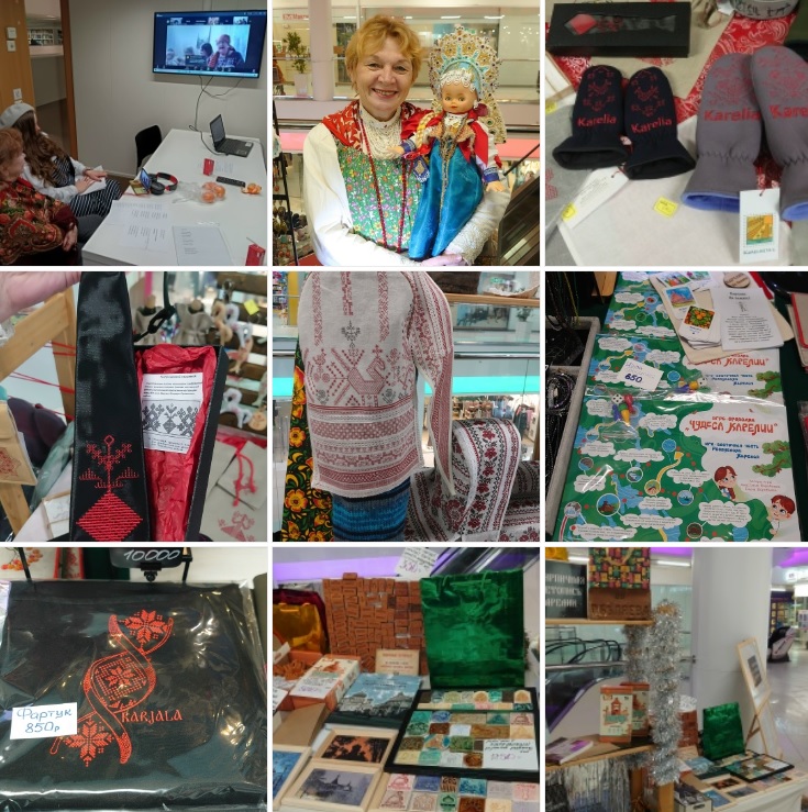 Елена Воробьёва представила настольную игру «Чудеса Карелии», а также сувениры и аксессуары с карельской вышивкой и куклу, одетую в традиционный женский костюм северных краёв.