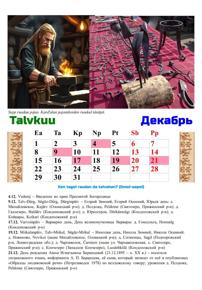 С началом декабря мы словно начинаем готовиться к чему-то новому, неизвестному. Мы заканчиваем всё то, что было начато ранее и начинаем задумываться, что бы мы хотели делать дальше. Нас уже ждут праздники и новые открытия. Мы предвкушаем встречи с друзьями и родными, которых уже давно не видели. И этому способствуют традиционные праздники карельских деревень. Так, например, Юрьев день — Егорий зимний (9 декабря) обычно отмечали в Михайловском, Пелдоже, Юркострове и Койкары, Варварин день (17 декабря) в Гомсельге, Николин день (19 декабря) в Новиково, Чарнаволоке и Кончезере.