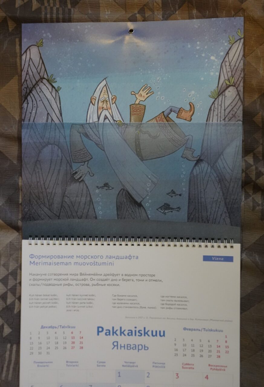 Сам календарь собрал в себе руны, касающиеся водной стихии. Месяц январь в календаре посвящён тому, как Вяйнямёйнен, плавая в море, создавал морской ландшафт — острова, проливы, отмели и многое другое. Именно он — вековечный песнопевец, а не созданная творчеством Лённрота Дева воздуха Илматар, которой никогда не было в карельских рунах.