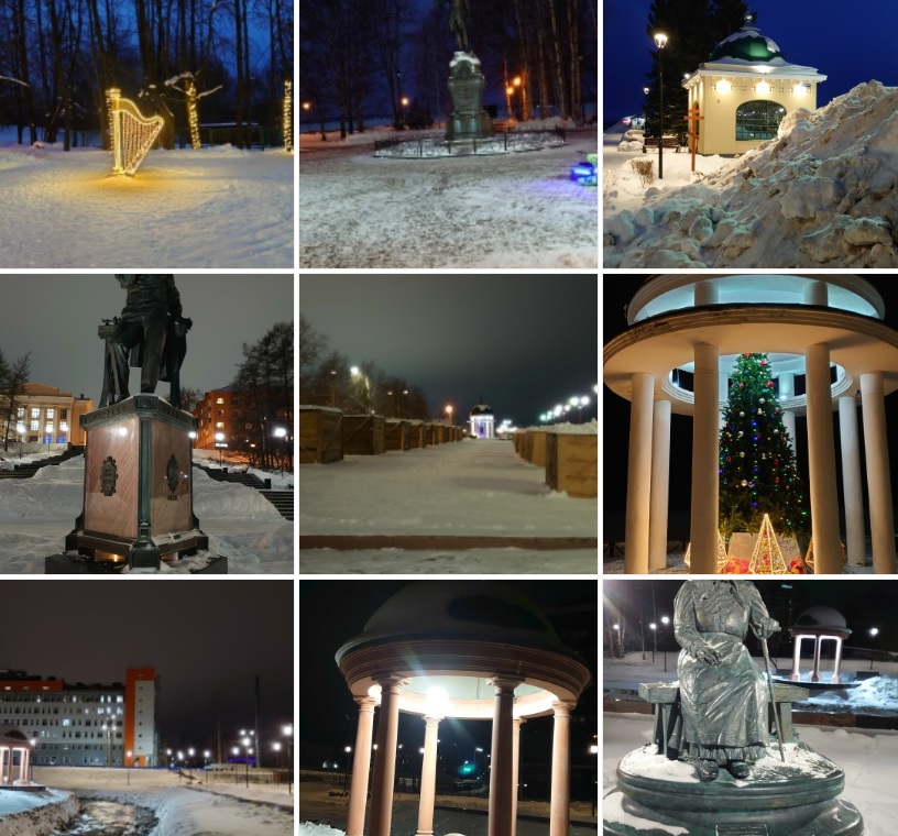 На прогулках по городу в зимней темноте и холоде становятся лучше видимы тенденции жизни столицы Карелии. То, что скрыто при свете дня, хорошо проявляется к вечеру. Оказывается наш город очень музыкальный, о чём прекрасно говорит образ арфы, открывающийся всем на спуске к озеру около Музыкального театра. Ведь арфа — это классическая родственница карельского кантеле, и она нисколько не чужда жителям Карелии. А у памятника Петру I на набережной мы попадаем в будущее, когда роботы заменили людей не только на работе, но и в туризме. Если раньше вокруг этого памятника толпились группы туристов, слушая рассказы гида, то теперь их место занимают милые электронные снегоходики, долго рассматривающие памятник и получающие информацию о Петре I прямо из интернета то ли в виде аудио, то ли написанную прямо машинными кодами. К сожалению, эти маленькие электросанки ещё не научились лазать по лестницам, и им пока никак не добраться до другого памятника — ювелиру Перхину, расположенному на возвышенности. И санкам только и остаётся ждать внизу на набережной пока кто-то сердобольный отнесёт их наверх, а потом спустит назад.