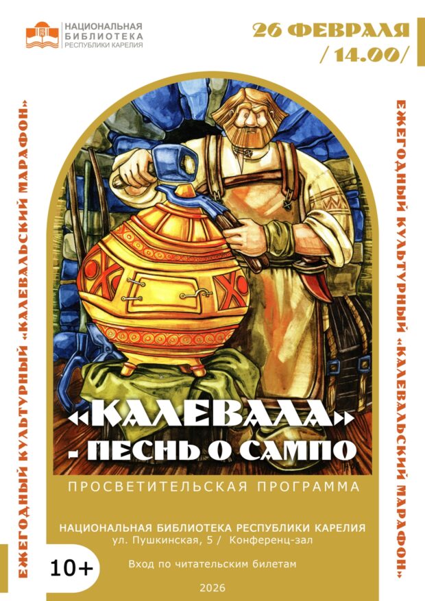 26 февраля в 14:00 в Национальной библиотеке Карелии пройдёт просветительская программа «Калевала — песнь о Сампо», посвящённая Дню Калевалы. В ходе программы прозвучат руны из этой эпической поэмы Лённрота на разных языках мира. Будут демонстрироваться иллюстрации художников к этой книге из книжной коллекции Национальной библиотеки. Гости мероприятия услышат рассказ о Сампо — о том, как его представляли сами рунопевцы и создатели художественных образов — поэты, музыканты, скульпторы, деятели кино.